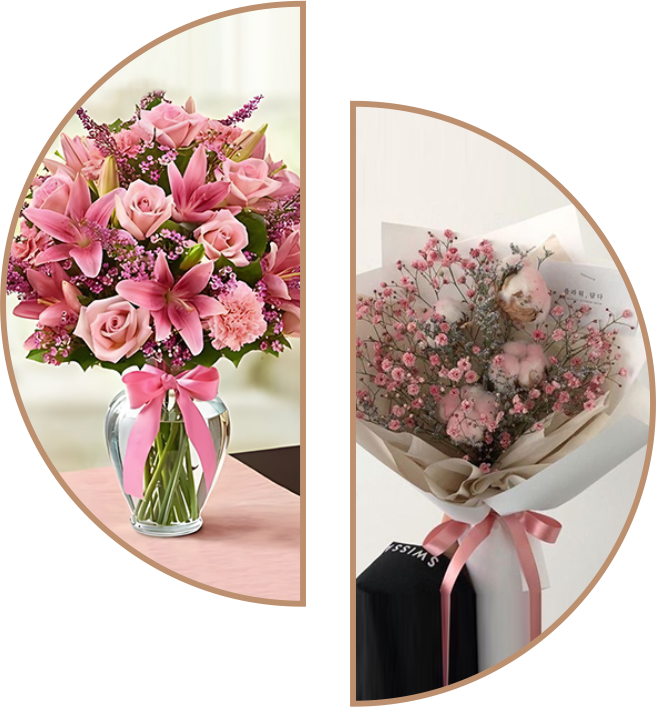 Berbagai macam jenis rangkaian Bunga Vas seperti bunga vas Anggrek, Lili, Mawar, Tulip, dll serta Bunga Tangan.